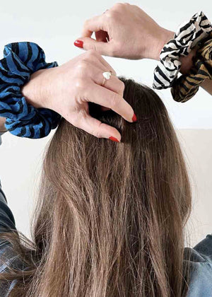 The Chou Chou muslin scrunchie in curry impresses with its warm yellow-brown shade, which radiates sunny lightness and naturalness. The striking zebra pattern adds a modern accent and gives the hair accessory an elegant yet modern touch.