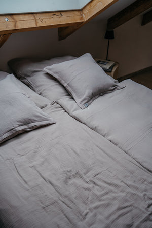 Der Musselin Duvetbezug ergänzt die gleichnamigen Musselin Kissenbezüge perfekt und schafft so ein harmonisches Gesamtbild im Schlafzimmer.