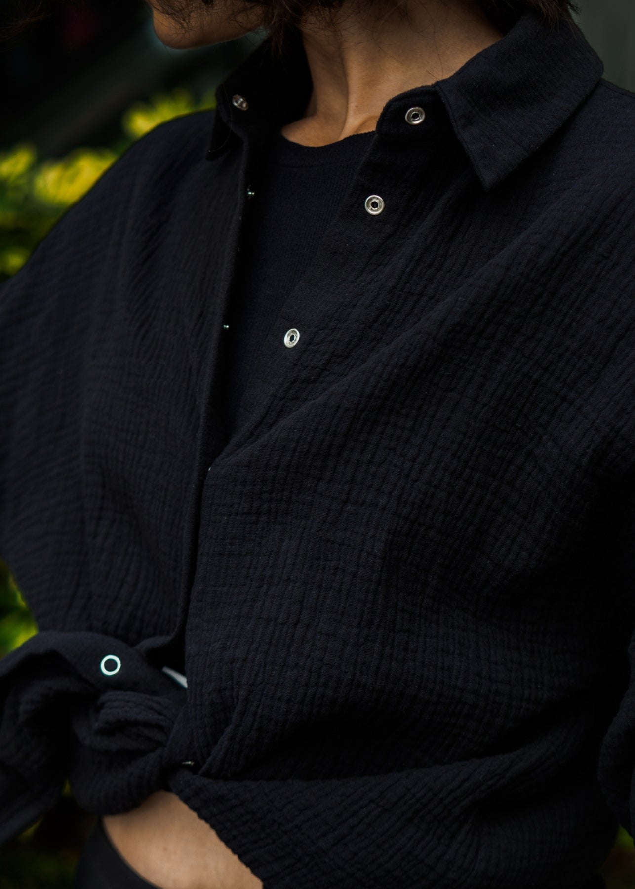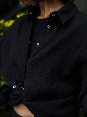 Der lockere Oversize-Schnitt schenkt dir maximale Bewegungsfreiheit, während die feuchtigkeitsregulierenden Eigenschaften des Musselins den ganzen Tag über für ein frisches Tragegefühl sorgen. Die Oversize Bluse Maja in der Farbe schwarz ist ein echtes Fashion-Highlight.