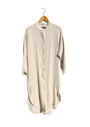 Ein sanft gerundeter Saum mit dezenten Seitenschlitzen sorgt für Bewegungsfreiheit und eine fliessende Silhouette. Natürliche Holzknöpfe und praktische Seitentaschen unterstreichen den funktionalen Charakter. Mit dem beiliegenden Stoffgürtel kannst du das Musselin Hemdblusenkleid individuell tragen. Locker für entspannte Momente oder tailliert für eine feminine Silhouette.