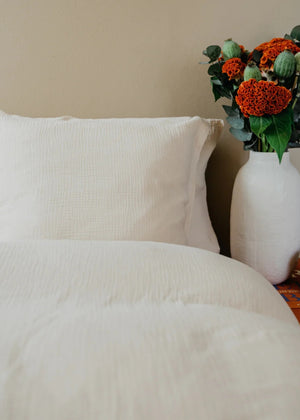 Der Musselin Duvetbezug ergänzt die gleichnamigen Musselin Kissenbezüge perfekt und schafft so ein harmonisches Gesamtbild im Schlafzimmer.