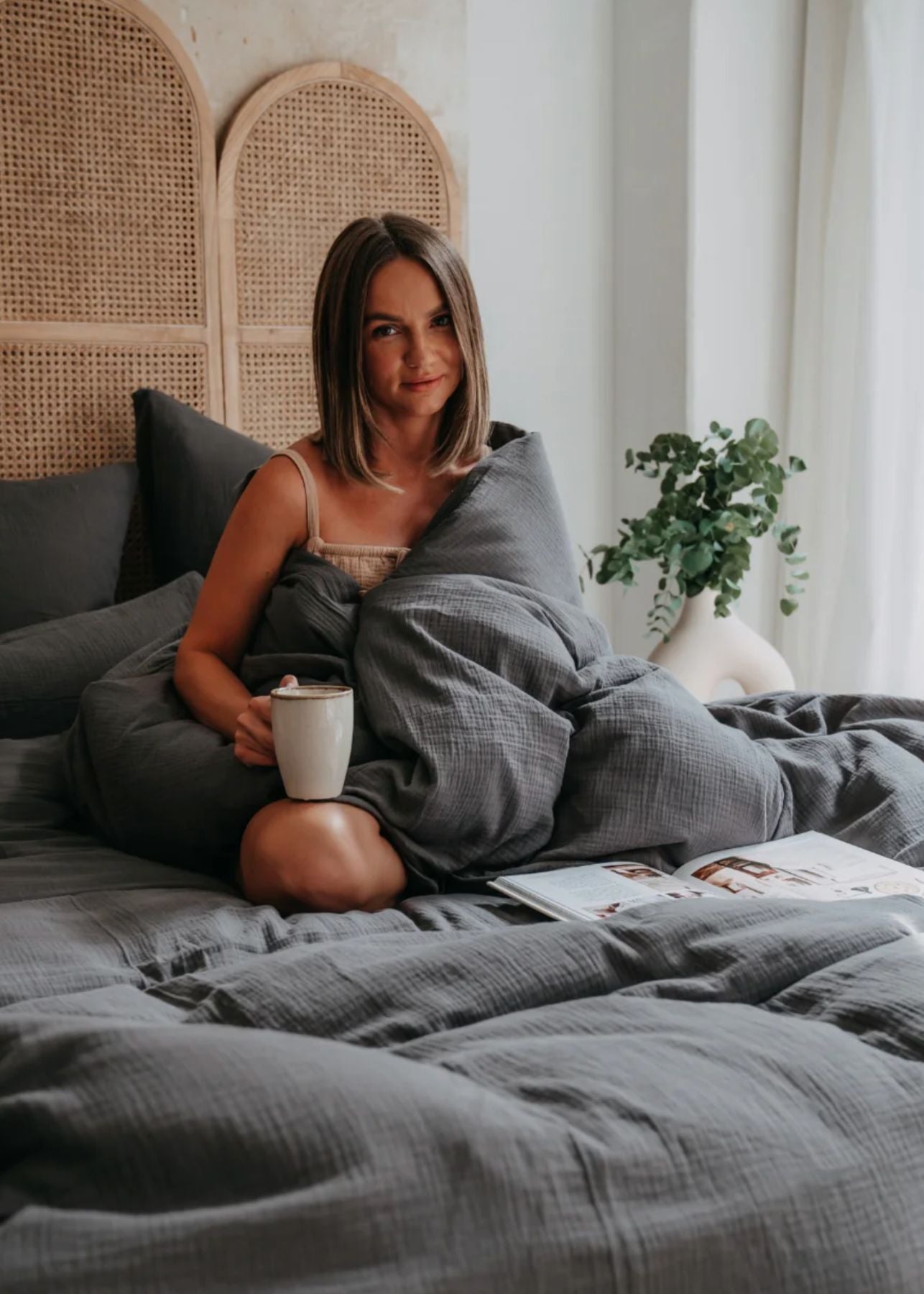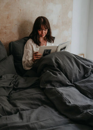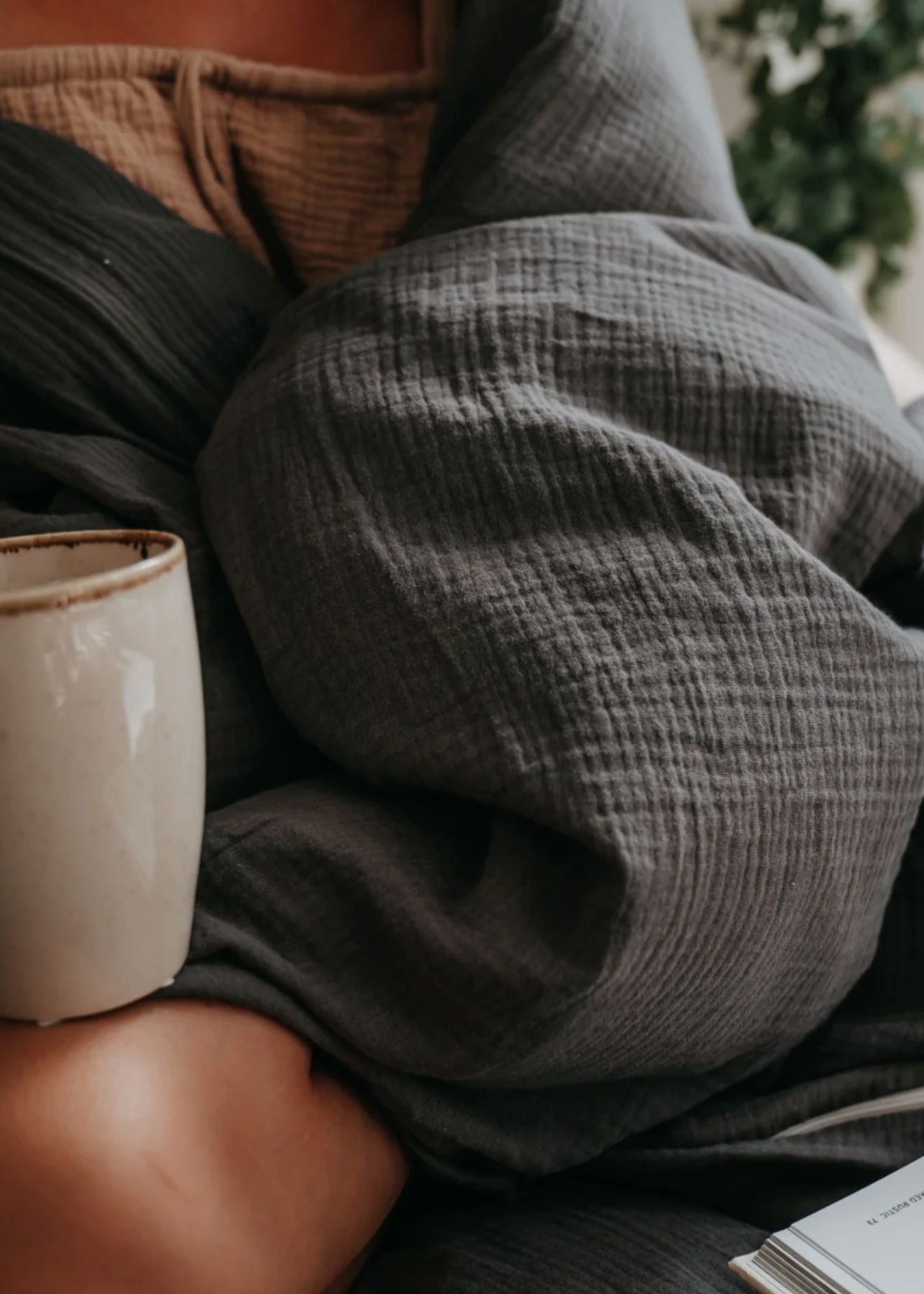 Der Bio-Musselin-Duvetbezug Eliane von hutch&PUTCH in der Farbe anthrazit bringt moderne Eleganz und spürbaren Komfort in dein Schlafzimmer. Der Farbton Anthrazit, ein tiefes Dunkelgrau, verleiht dem Duvetbezug eine stilvolle Zurückhaltung und macht ihn vielseitig kombinierbar - sowohl mit hellen als auch mit kräftigen Farben.