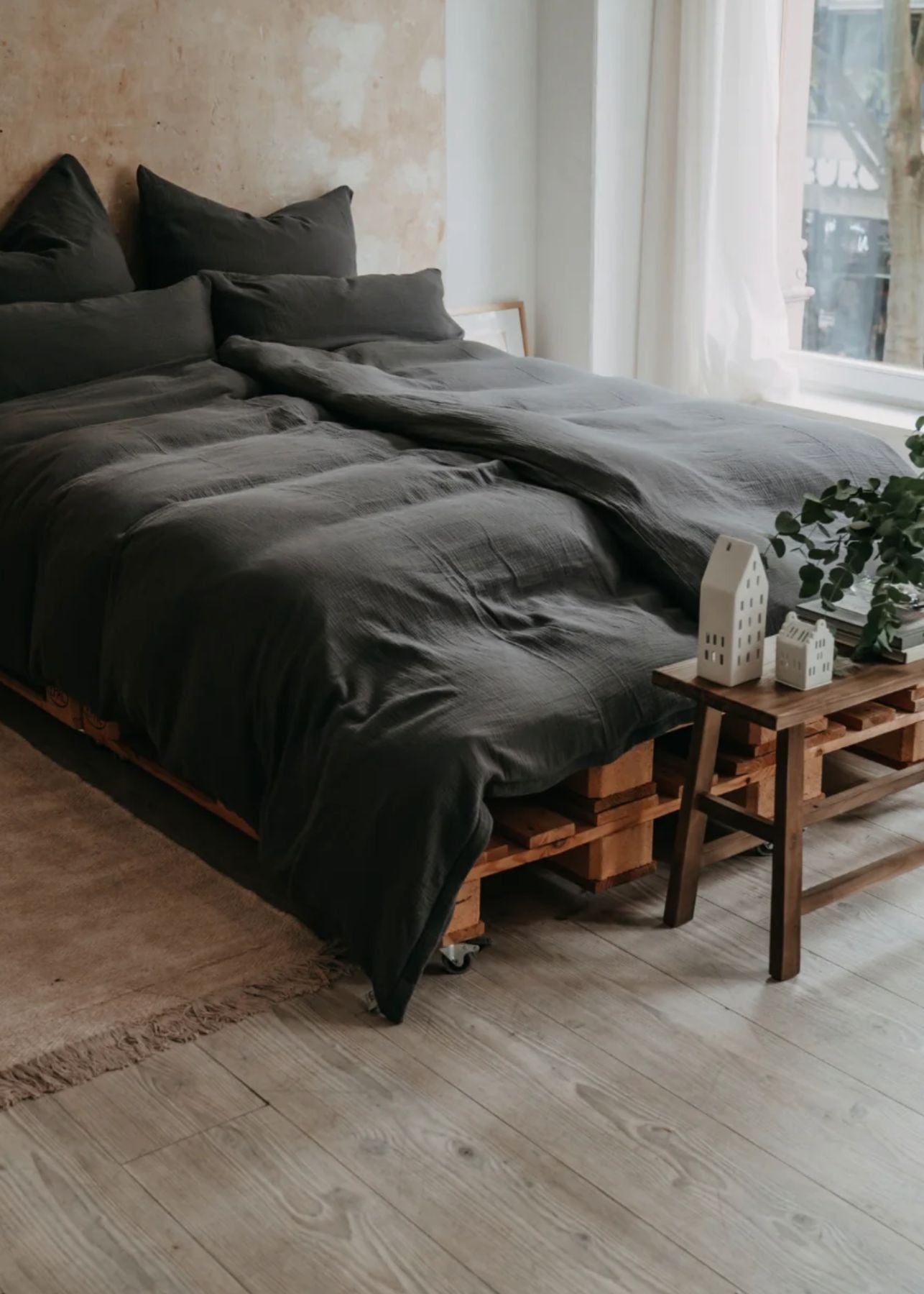 Der Musselin Duvetbezug ergänzt die gleichnamigen Musselin Kissenbezüge perfekt und schafft so ein harmonisches Gesamtbild im Schlafzimmer.