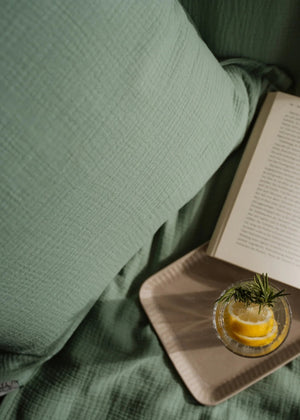 Der Bio Musselin Duvetbezug Eliane von hutch&PUTCH in der Farbe Eucalyptus ist die perfekte Ergänzung zum gleichnamigen Musselin Kissenbezug und bringt eine ruhige, natürliche Harmonie in dein Schlafzimmer. Der sanfte Grünton erinnert an frische Eukalyptusblätter im Morgenlicht, wirkt ausgleichend und beruhigend – und schafft eine Atmosphäre von Leichtigkeit, Klarheit und wohltuender Gelassenheit.