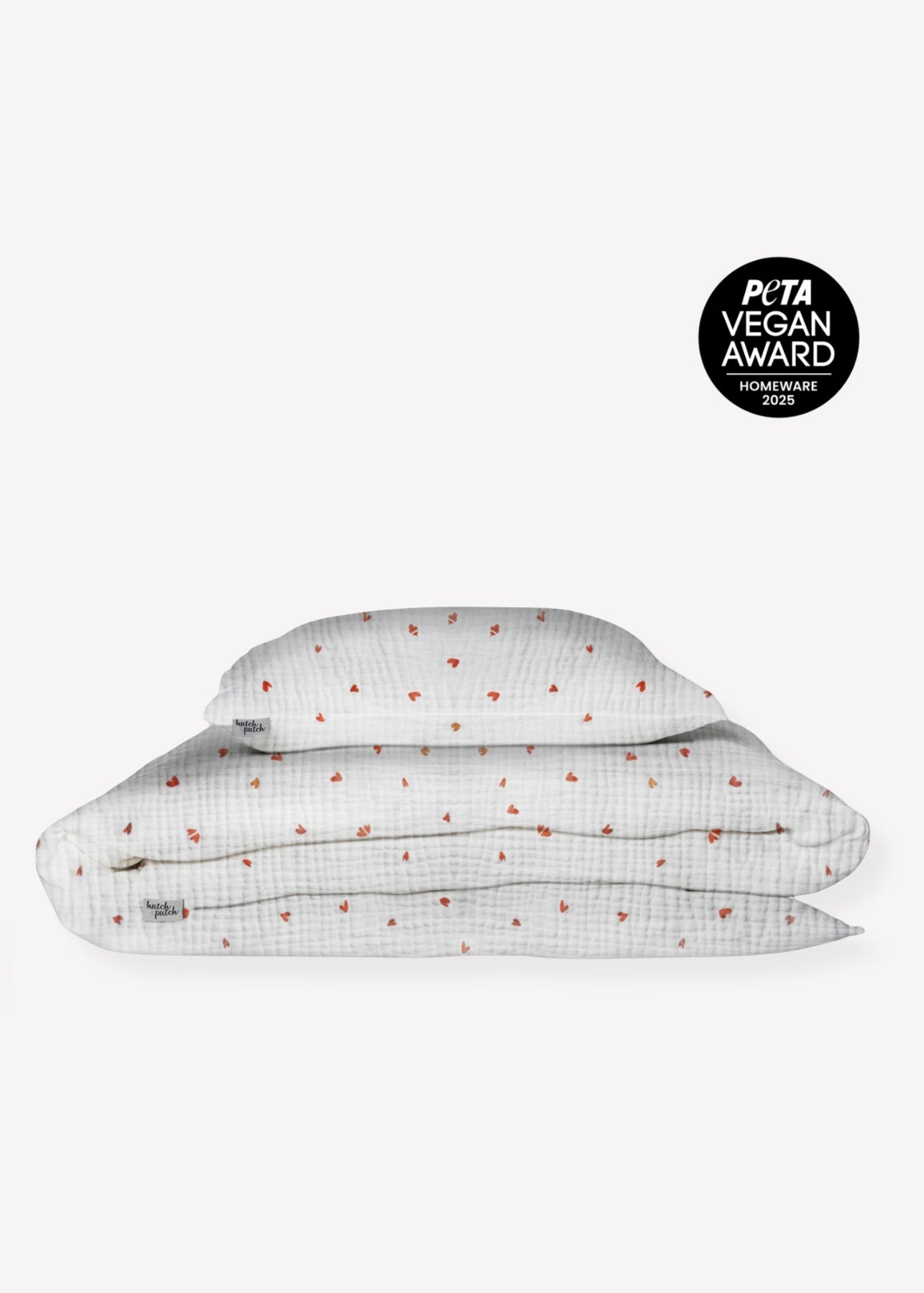 Der Bio-Musselin Duvetbezug Eliane von hutch&PUTCH in der Farbe Little Love verleiht deinem Schlafzimmer eine zarte, romantische Note. Das feine Muster aus kleinen roten Herzchen auf weissem Hintergrund strahlt Leichtigkeit und Wärme aus und bringt liebevolle Details in dein Zuhause. Mit seiner weichen Haptik und natürlichen Eleganz schafft der Duvetbezug eine Atmosphäre voller Geborgenheit