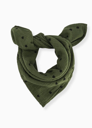Das Musselin-Halstuch Bianca von Rose in April in Khaki Coeur kombiniert einen warmen Khaki-Ton mit einem zarten Herzchen-Design in Schwarz. Die erdige, olivgrüne Nuance verleiht dem Tuch eine natürliche, zugleich stilvolle Ausstrahlung. Ein liebevolles Detail für jeden Look – dezent verspielt, modern und perfekt für jede Jahreszeit.