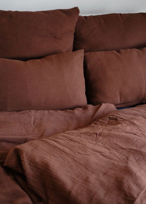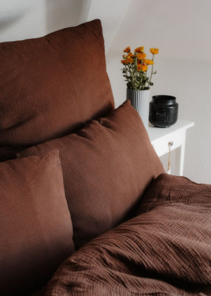 Der Bio-Musselin-Kissenbezug Eliane von hutch&PUTCH in der Farbe Chocolate ergänzt den gleichnamigen Musselin-Duvetbezug perfekt und bringt eine warme, erdige Note in dein Schlafzimmer. Der tiefe Braunton erinnert an sanfte Herbstabende, wirkt elegant, beruhigend und natürlich. Der Musselin-Kissenbezug schafft eine gemütliche, zeitlos schöne Atmosphäre voller Geborgenheit.