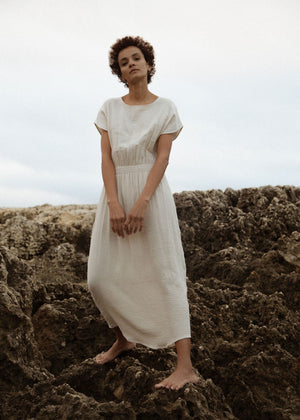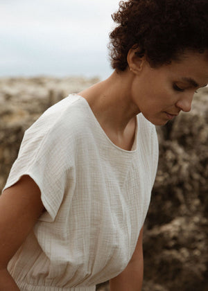 Der lockere Schnitt an den Schultern sorgt für hohen Komfort, während die elastisch geraffte Taille eine sanft definierte Silhouette schafft. Die fliessende Länge macht das Musselin Kleid zu einem mühelosen Begleiter, ganz gleich ob drinnen oder draussen.