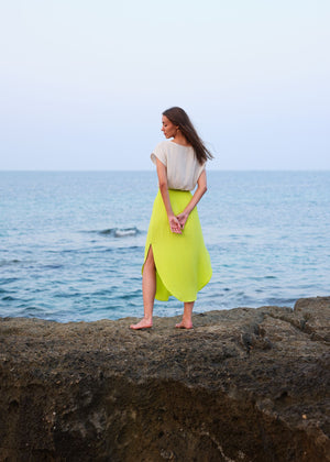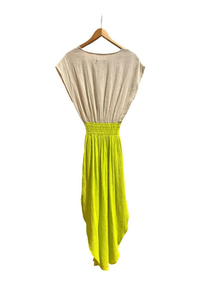 Das Musselin-Kleid Maimò von Cecilia Sörensen in der Farbkombination Beige und Neongelb vereint einen warmen Naturton mit einem frischen, leuchtenden Gelb. Die Kombination aus sanfter Basis und strahlendem Akzent wirkt modern, lebendig und verleiht dem Kleid eine sommerlich positive Ausstrahlung.