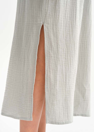 Das Musselin-Kleid V von Cecilia Sörensen in Sage Green zeigt sich in einem sanften, gedeckten Grünton mit grauer Nuance - eine harmonische Farbe zwischen Grün, Grau und einem Hauch Blau. Sie wirkt ruhig, modern und elegant zugleich und fügt sich mühelos in jede Garderobe ein. Der Farbton betont den natürlichen Stil des Kleides und macht es ideal zum Layern. Ob solo getragen oder mit ausgewählten Accessoires kombiniert, entsteht ein Look voller Schlichtheit und zeitloser Leichtigkeit.