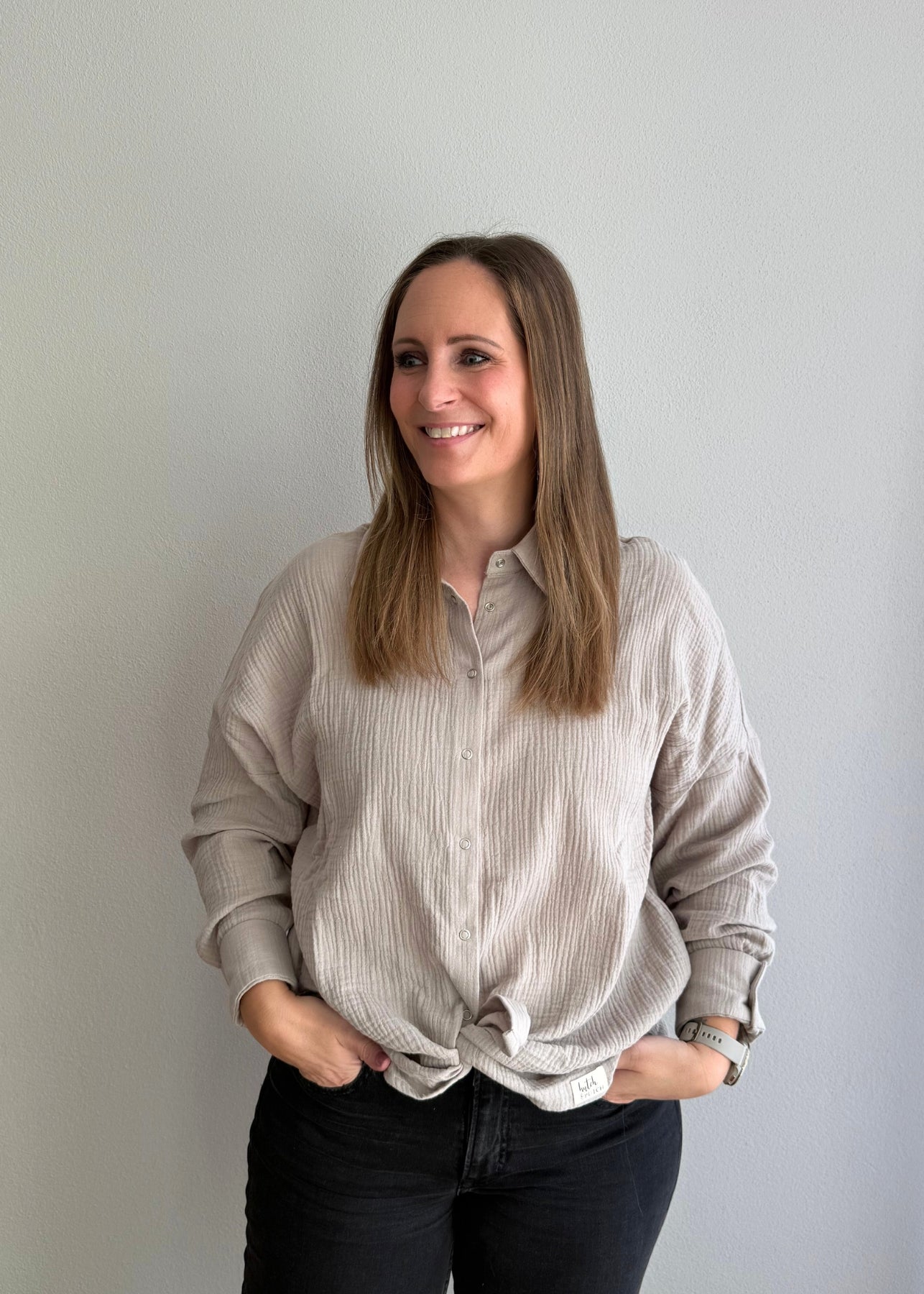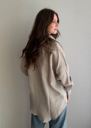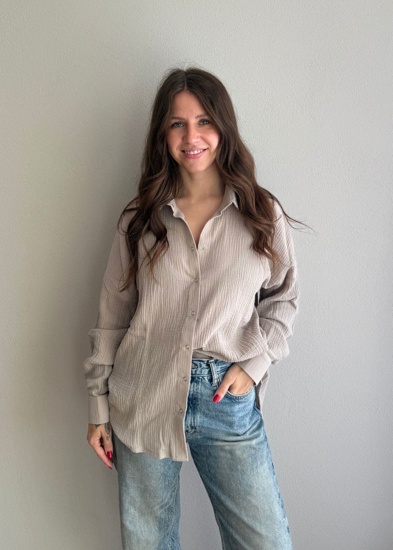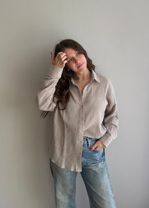 Der lockere Oversize-Schnitt schenkt dir maximale Bewegungsfreiheit, während die feuchtigkeitsregulierenden Eigenschaften des Musselins den ganzen Tag über für ein frisches Tragegefühl sorgen. Die Oversize Bluse Maja in der Farbe stone ist ein echtes Fashion-Highlight.