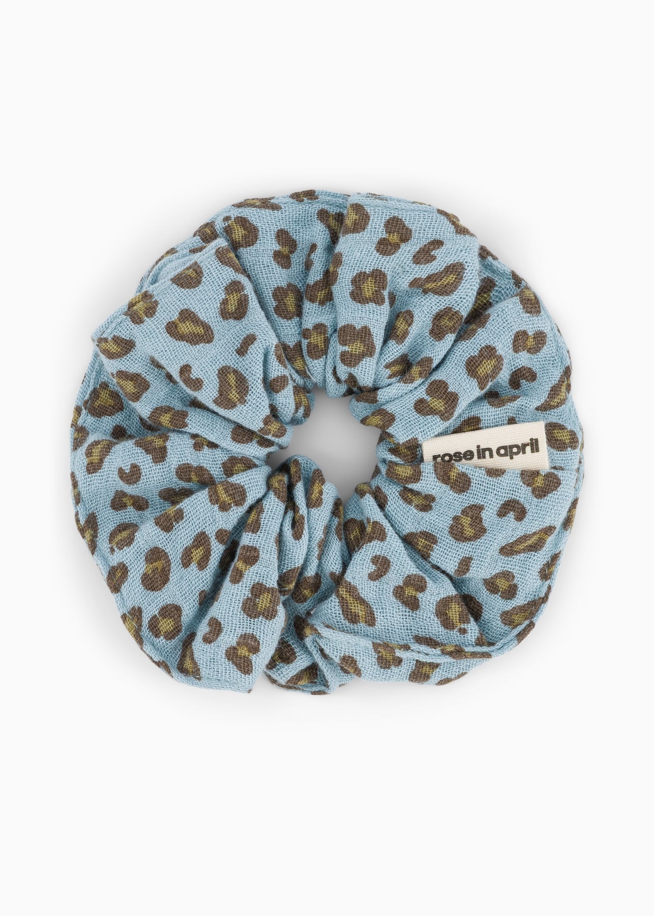 Das Musselin-Scrunchie Chouchou von Rose in April im Mini Leopard Himmelblau verbindet eine frische, helle Farbigkeit mit einem feinen, zurückhaltenden Muster. Der zarte Hellblauton wirkt leicht und beruhigend, während der Mini Leo Print dem Accessoire einen stilvollen, modernen Akzent verleiht.