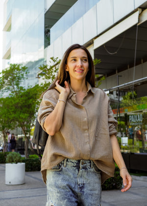 Der lockere Oversize-Schnitt schenkt dir maximale Bewegungsfreiheit, während die feuchtigkeitsregulierenden Eigenschaften des Musselins den ganzen Tag über für ein frisches Tragegefühl sorgen. Die Oversize Bluse Maja in der Farbe taupe ist ein echtes Fashion-Highlight.