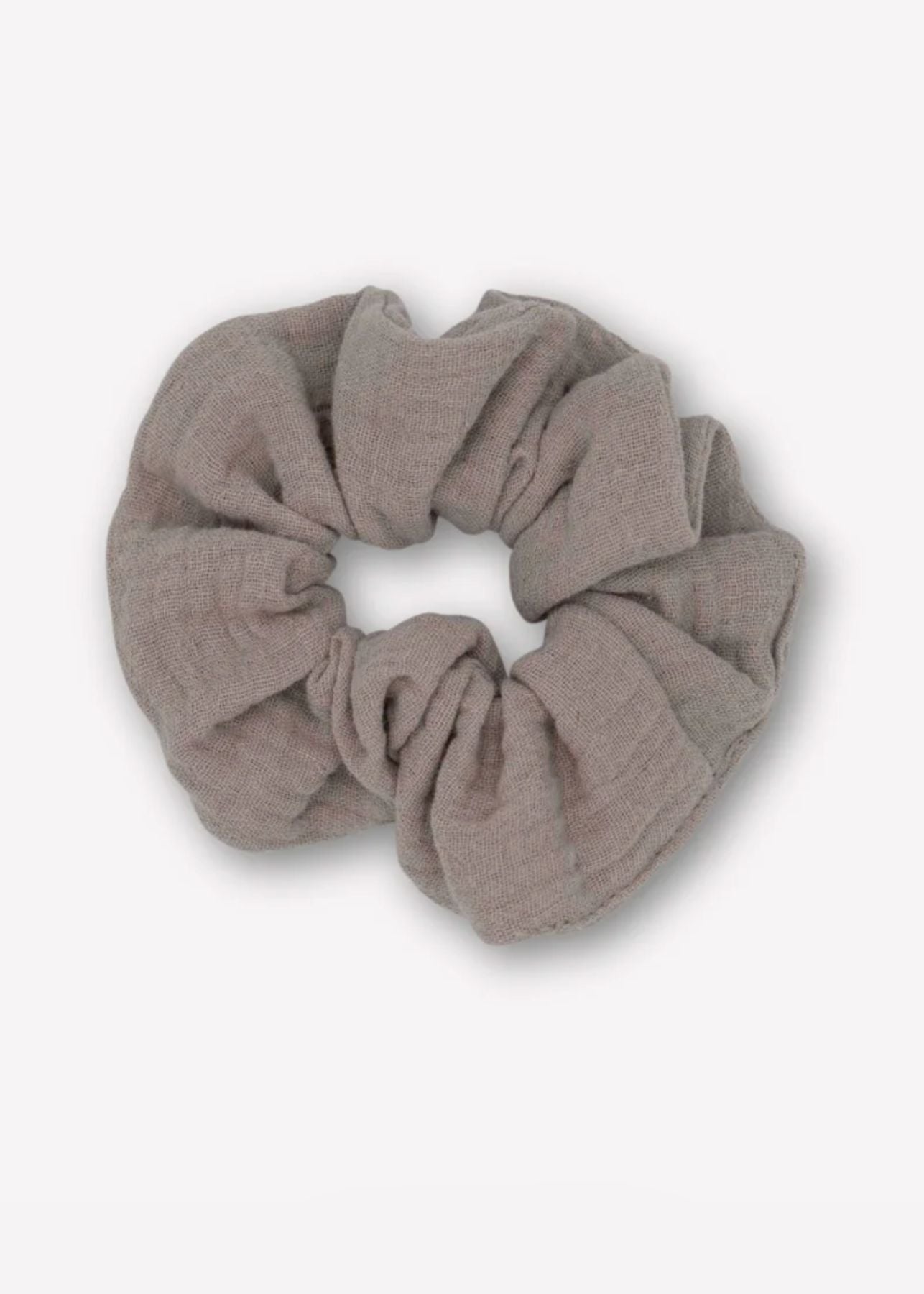 Der Farbton Stone, ein dezentes Taupe-Grau mit beigen Nuancen, macht das Musselin-Scrunchie vielseitig kombinierbar und zum idealen Allrounder für elegante wie auch lässige Outfits.